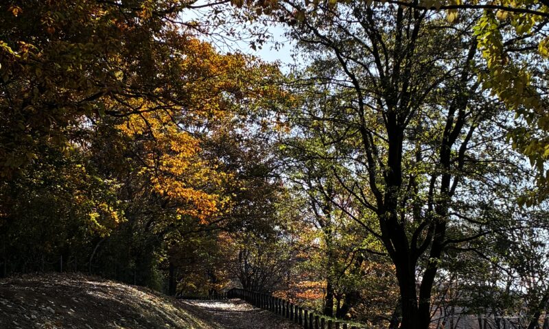 まだ赤や黄色の葉が残っている木々の間をあるいて
